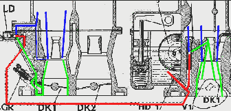 | Das Benzin (rot) gelangt über die Hauptdüse I (HD1) zur Leerlaufdüse (LD). Die Leerlaufdüse bestimmt die Benzinmenge des Leerlaufgemisches und vermischt es mit der Luft (blau) welche durch die Öffnung im linken Venturi oben links angesaugt wurde. Dieses Luft-Benzingemisch (grün) strömt nun über kleine Bohrungen unterhalb der Drosselklappe in den Ansaugkanal und vermischt sich mit der Luft (auch blau) welche durch den Spalt der Drosselklappe angesaugt wird. Nun kann das Ganze zu den Zylindern strömen. Mit der Leerlaufgemischregulierschraube (LGR) kann man zusätzlich Gemisch beigeben und so das Gemisch feiner abzustimmen. Z.B. bei der AU. |